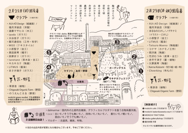 湘南の作家の作品を扱う「オケバ」とモキチカフェが共同で主催するライフスタイルマーケット「くまざわ市」。オケバゆかりの作家によるクラフト作品や日用品、味わいのある一点ものに加え、無農薬野菜や花、古道具など、いつもお世話になっているお店が中庭に集まります。当日はカフェ特製のパンやスイーツ、屋台も登場。作家さんとの会話を楽しみながら、ここでしか出会えない“お気に入り”を探しに、春の気配を感じる中庭へぜひお越しください。