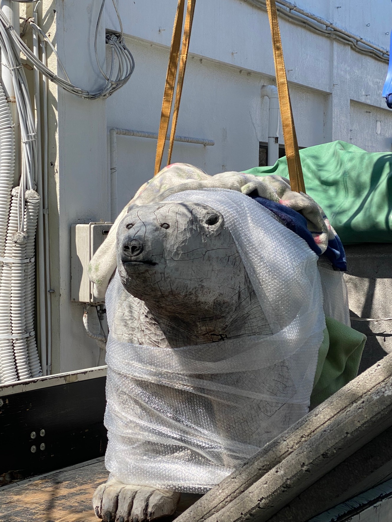 今年4月に熊澤に突然現われたこちらのシロクマ、実は北川原 沙耶さんによる彫刻作品です。実物のスケールで彫り出された作品の迫力と細かいディテールはまるで本物のシロクマさながら。