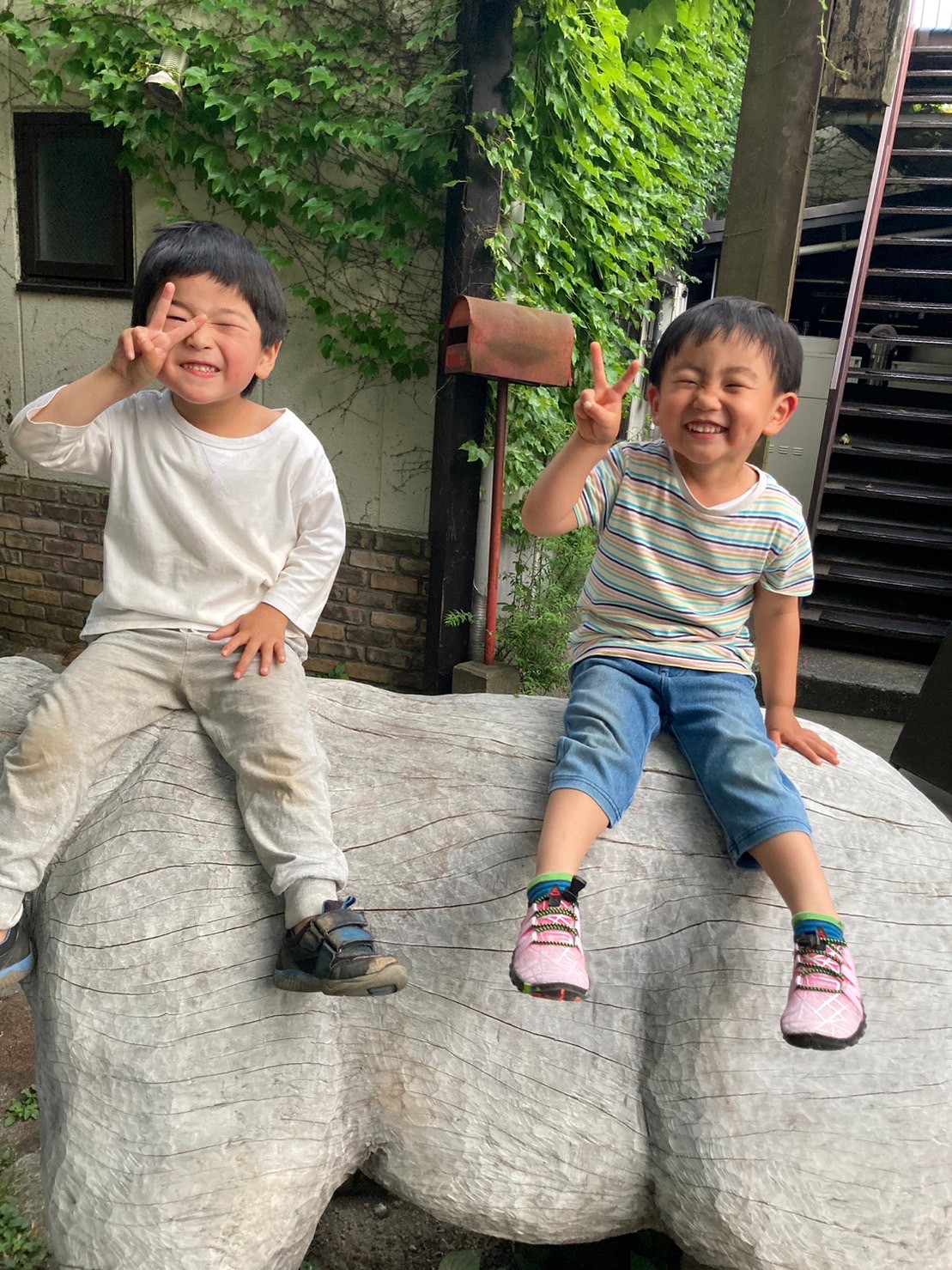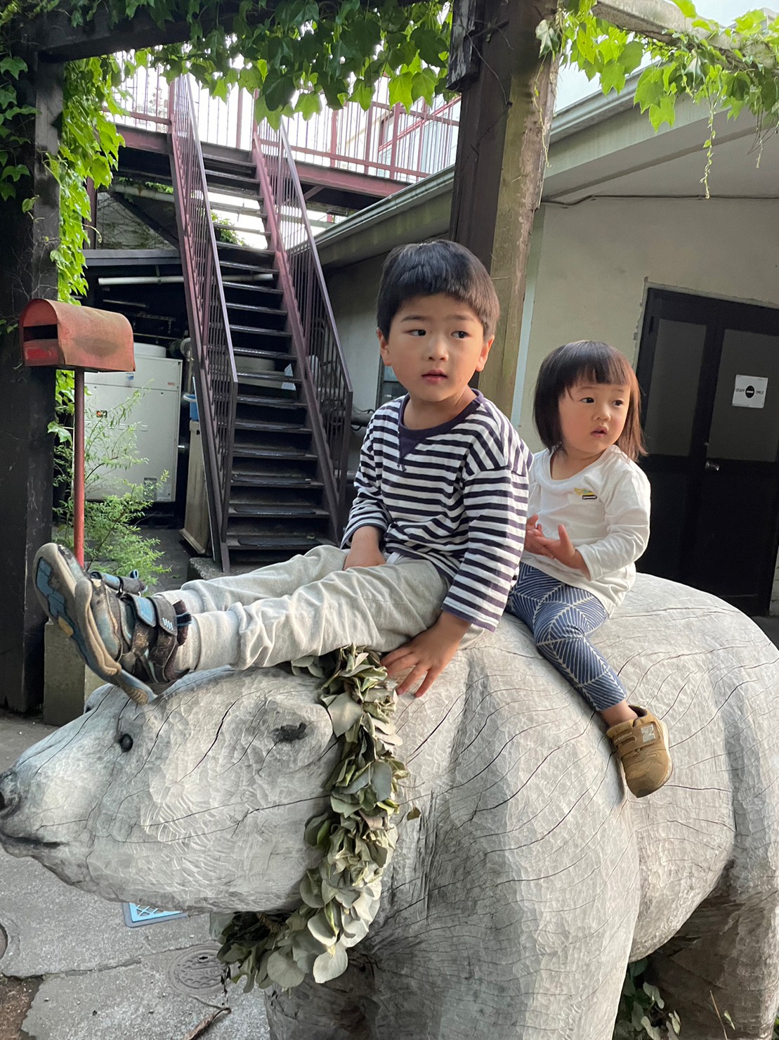 小田原で調達した立派なクスノキから大胆にチェーンソーで彫り出された実物大の熊は成人男性が乗ってもなんのその。ビッグスケールで力強い作品は、もちろん引っ越し作業も大がかり!2tトラックとクレーンが出動する大規模搬入を経て、この熊澤のお庭へと辿り着きました。