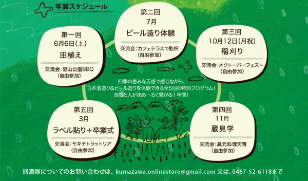 1年を通じて「酒米プロジェクト」に関わり自分達のお酒を造る体験型企画「熊酒隊」。その第2期隊員募集のお知らせです!毎回交流会もあり、お酒を味わいながら楽しく学べる充実の内容となっています。皆様のご参加をお待ちしています!