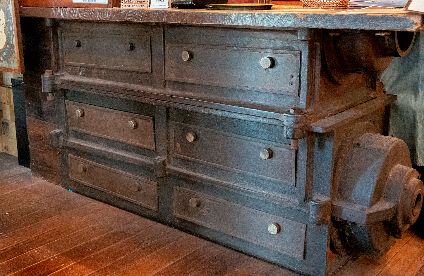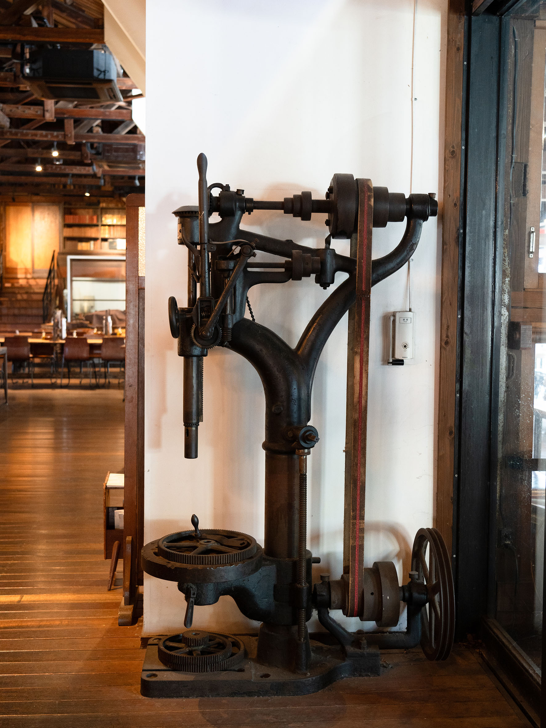 例えば敷地入口で夕闇の中ボーっと鈍い光を放つ看板。これは精麦機の部品に照明を入れて看板として再利用したものです。また店の正面レジカウンターの台の下部もよく見ると大きな部品であることがわかります。その他入口左手のパン屋でも隠れミッキー的に使われているのでご注目!また入口横の黒い機材は、工具室に残っていた旋盤です。骨太なイケメン、かつては相当な働き者として頼られていたのでしょう。今ではお客様を最初に出迎えるポジションを陣取って活躍中です。これらインダストリアルな部品達は、店に欠かせない名バイプレイヤーとして第二の人生を謳歌しています。