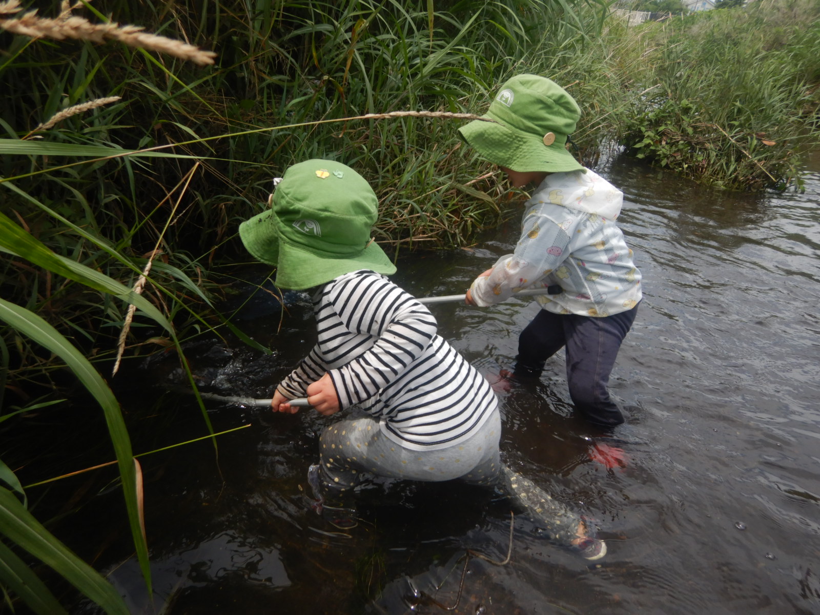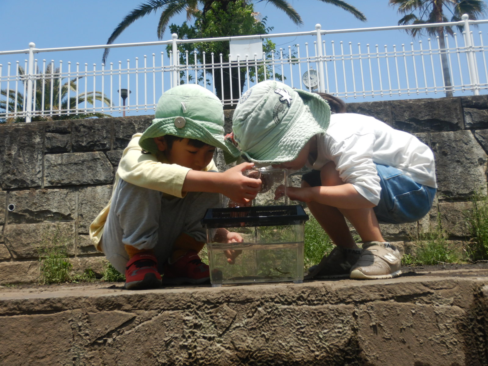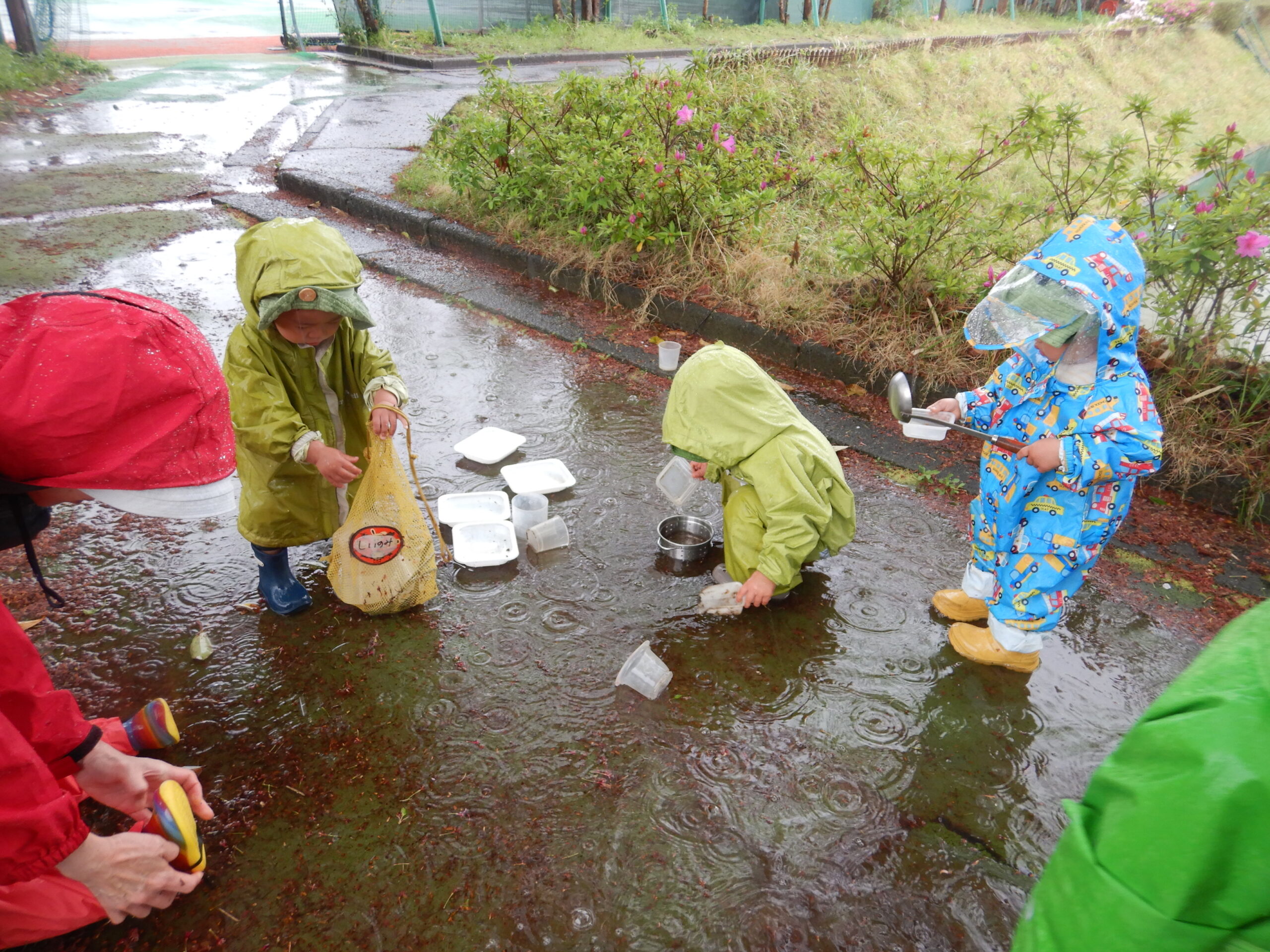 子供が主役のもあな保育園。毎朝話し合いで、今日のお出かけ場所が決まります。どこに行っても、何を見ても子供にとっては冒険と発見の連続!暑い日は川でザリガニ釣りやヤゴ、エビ釣り。雨の日だってラッキーデー!台風でない限りは元気にお出かけし、迷わずズブズブと水たまりに入ります。お友達同士コップで雨水シャワーのかけ合いは日常茶飯事。ある雨の日には、裏山を下りて酒造の敷地にやって来ました。石畳はピチャピチャ雨が跳ね返る音がするんだね!見てみて、水路にタニシがいるよー!わあ、葉っぱが流れてきた!自然と仲良くなりながら五感をフル稼働して色んなことを学びます。