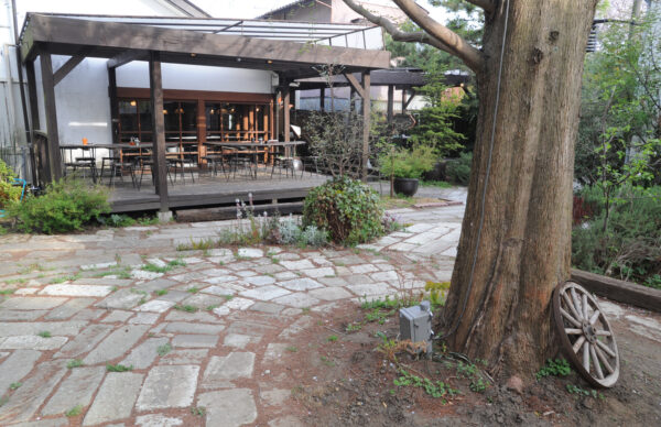 敷地全体も、入口アーチを増設しワクワク感を演出、中庭や店舗前のファサードに枕木や大谷石を使用し本来のカジュアル路線に併せて、クラフトマンシップとリゾート感が漂う空間へと変化していきました。それでも、熊澤の流儀は外しません!この時使用した大量の木材は近隣の材木屋さんや地方の酒蔵を回り不用品を譲り受け、処分に困った大量の大谷石があると聞けばトラックで引き取りに回って集めてきた戦利品でした。こうして、唯一無二なモキチ的空間が出来上がりました。