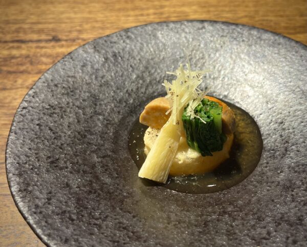 ■旬魚の燻製 旬菜巻き 金柑のエスプーマ