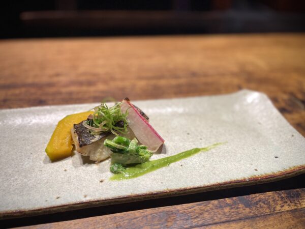 <前菜> ■アマゴの真砂揚げ 吟醸粕漬けクリームチーズの山葵漬け和え