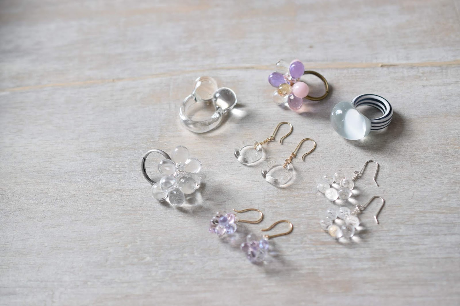 アクセサリーは、シンプルながら個性的な雰囲気を持ち、ガラスの透明感も加わり、夏の彩に大人気です。